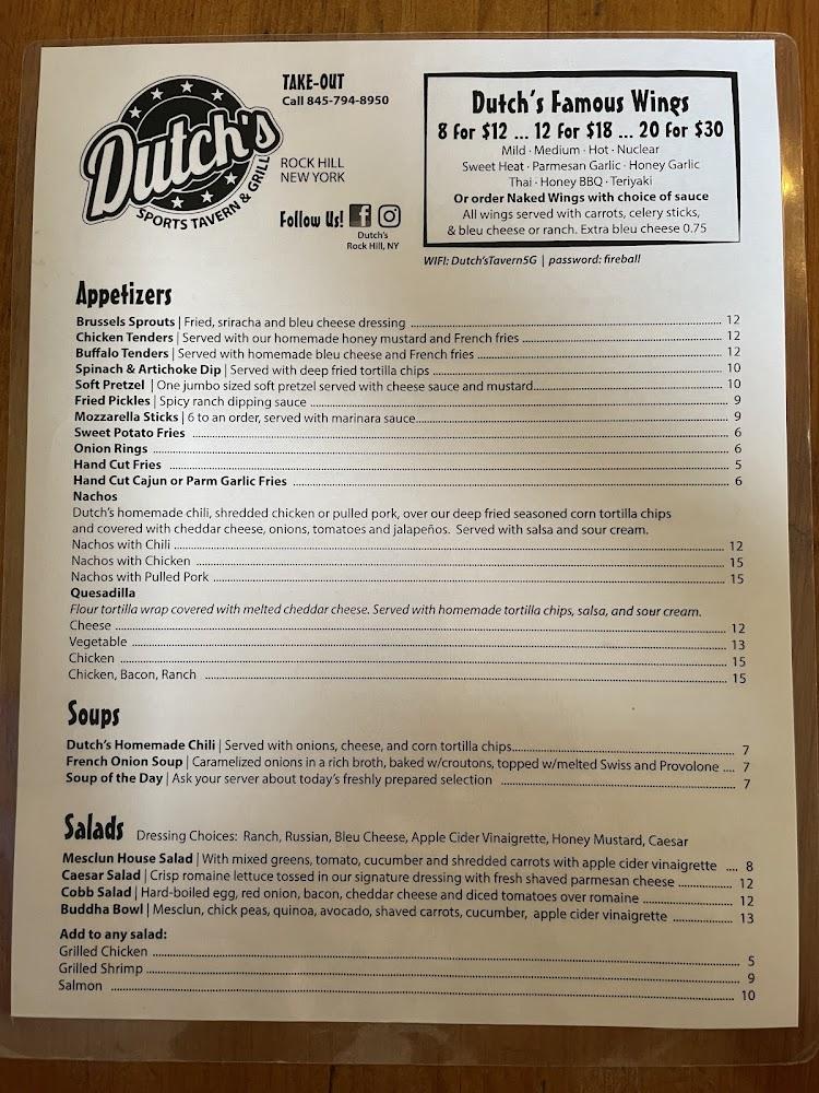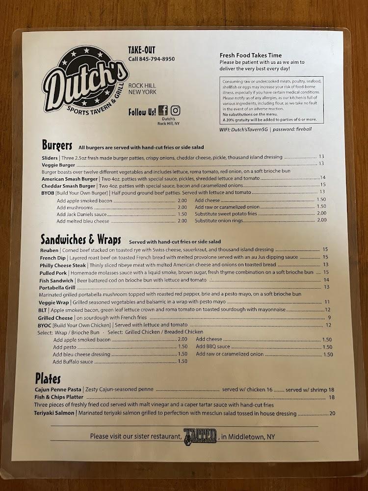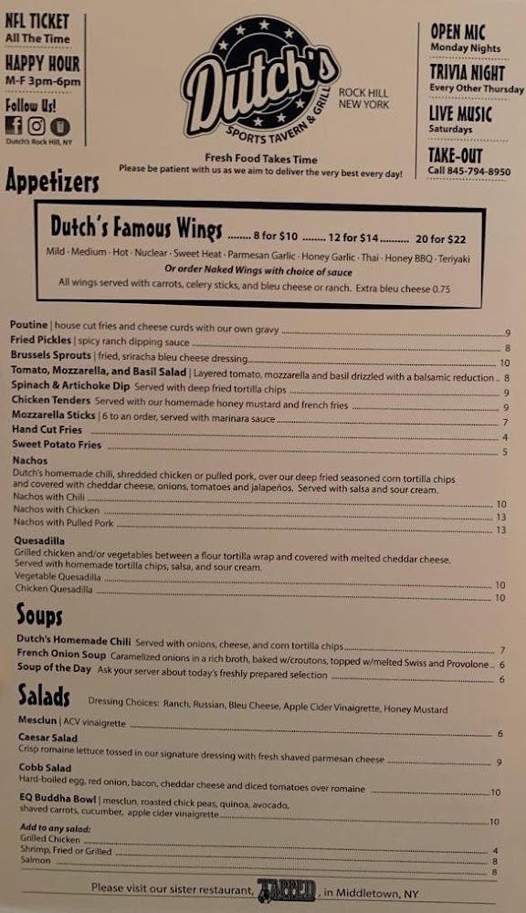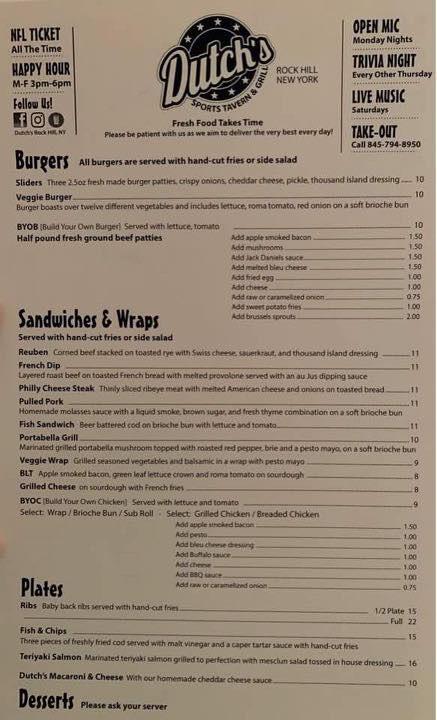 Welcome to Dutch's, your go-to restaurant and bar in Rock Hill, NY! Nestled at 206 Rock Hill Dr, we offer a cozy atmosphere with a diverse menu featuring local specialties and a wide selection of beers and cocktails. Enjoy dining on our terrace or opt for takeout and delivery. Join us for lively concerts and catch the game with friends while savoring our happy hour specials. We cater to families, groups, and solo diners, with accessible facilities to ensure everyone can enjoy our delicious food and vibrant ambiance. Visit us for brunch, lunch, or dinner – we can't wait to serve you!